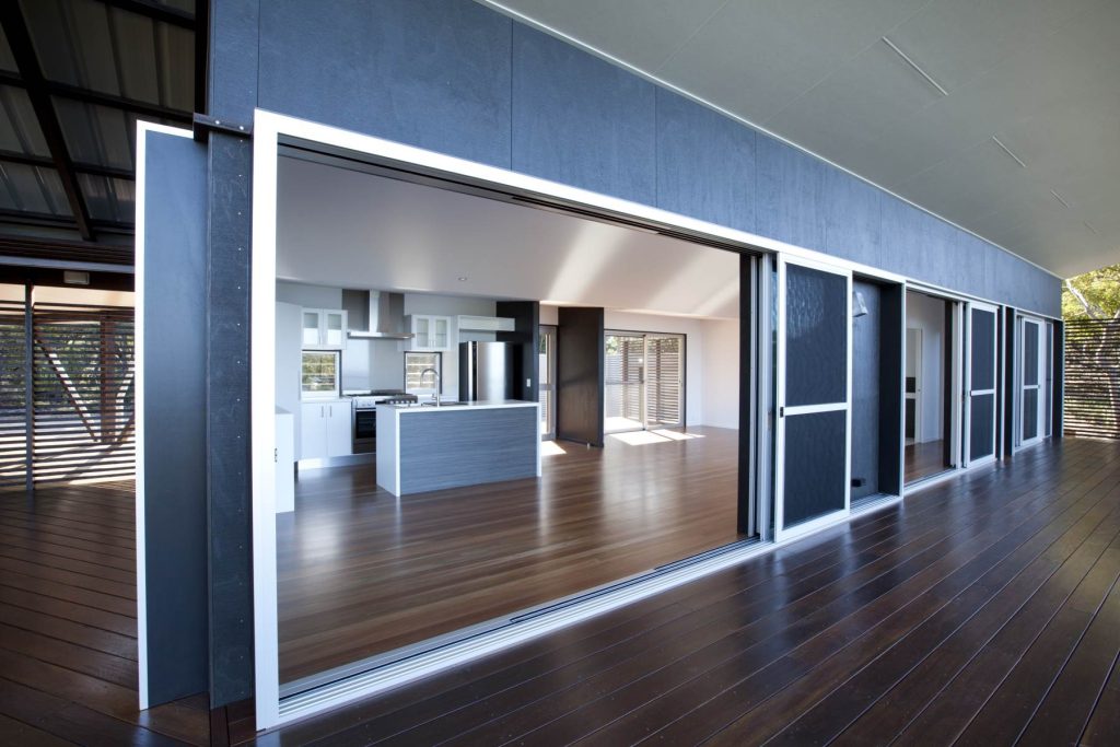 AWS Series 618-3 track sliding doors and screens open on to an expansive deck and showcase the breathtaking view across the rolling ocean. To ensure a seamless transition between the indoor and outdoor spaces, the multiple stack of three glass doors and three flyscreens slide on the outside of the walls, cleverly concealing them from the main living areas when open.